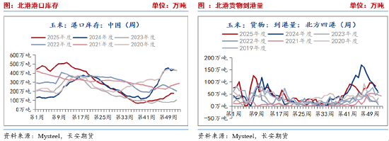 从饲料企业常备库存来看,企业玉米库存为29.98天,自10月下旬以来,饲料企业库存持续企稳回升。同比来看,仍不及去年同期的30.79天,但已经相差无几。从饲料产量来看,2025年11月全国工业饲料产量2873万吨,环比减少1.2%,同比增长2.7%。其中,配合饲料、浓缩饲料、添加剂预混合饲料同比分别增长2.6%、4.5%、0.1%。其中全国饲料企业生产的配合饲料中玉米用量占比为43.8%。2025年1-11月全国饲料产量30896.2万吨,同比增长6.0%。暗示目前生猪饲料需求仍有保障,并在春节前继续支撑玉米需求,但受制于玉米价格偏高以及库存持续积累,未来对玉米需求的增量空间有限。